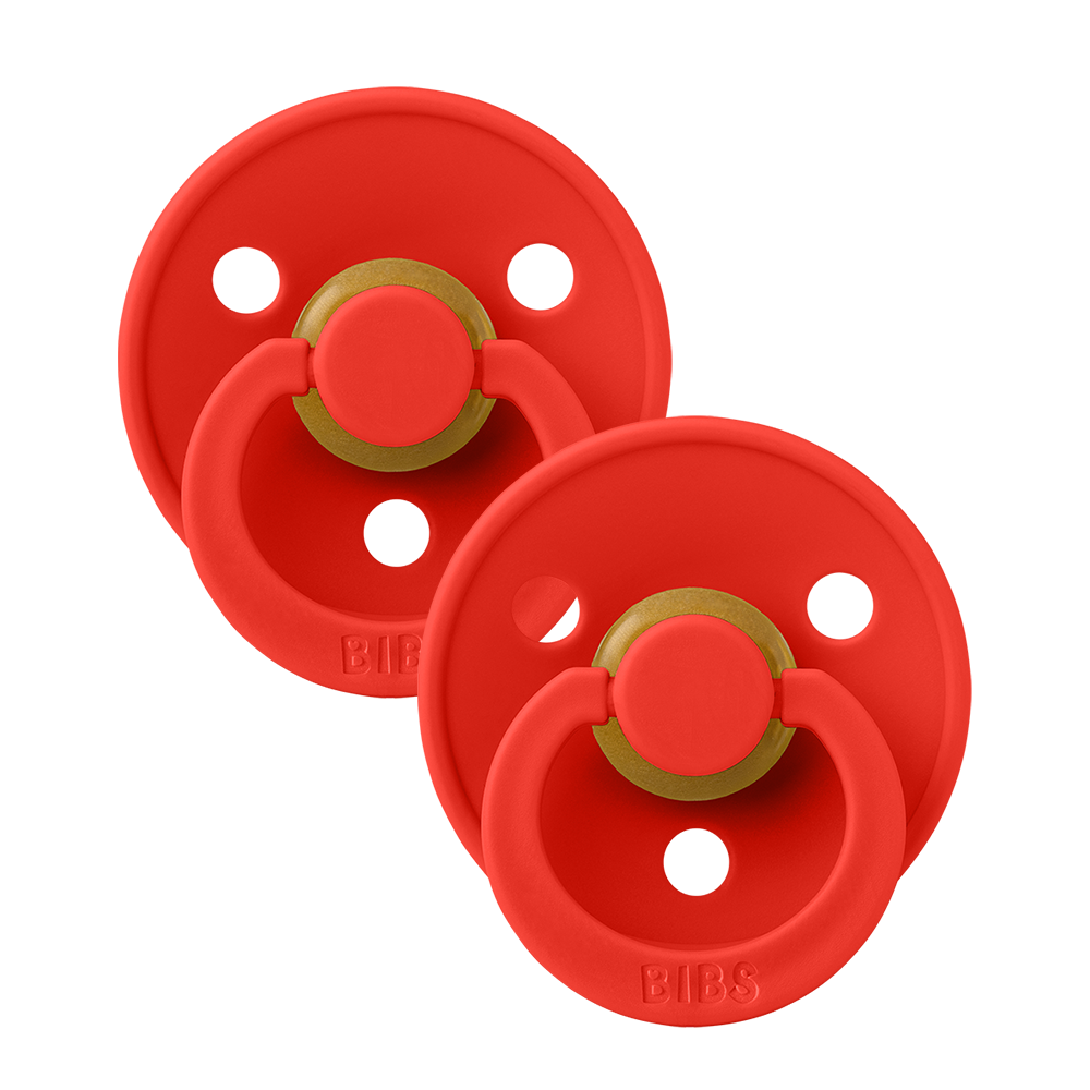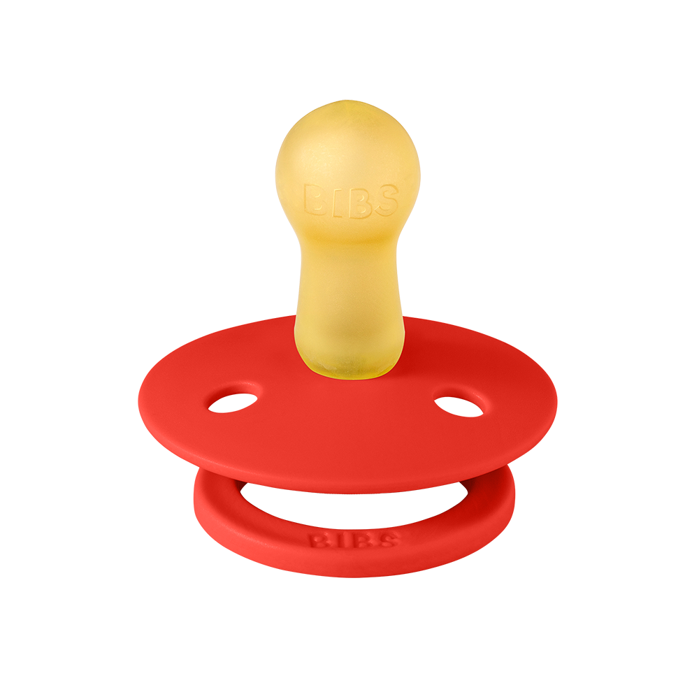 Our Colour pacifier is the original BIBS pacifier and has been on the market for over 40 years. It has the signature round BIBS shield with three vent holes and round BIBS engraved handle ring.