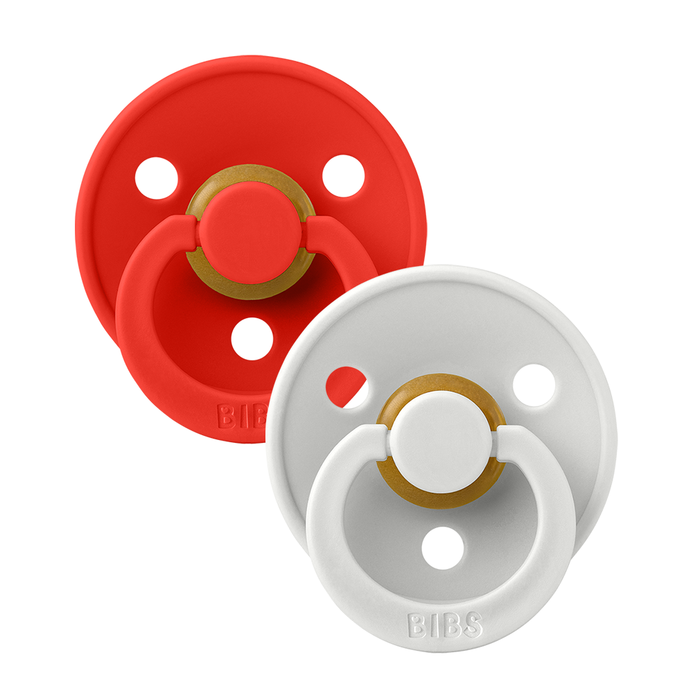 Our Colour pacifier is the original BIBS pacifier and has been on the market for over 40 years. It has the signature round BIBS shield with three vent holes and round BIBS engraved handle ring.