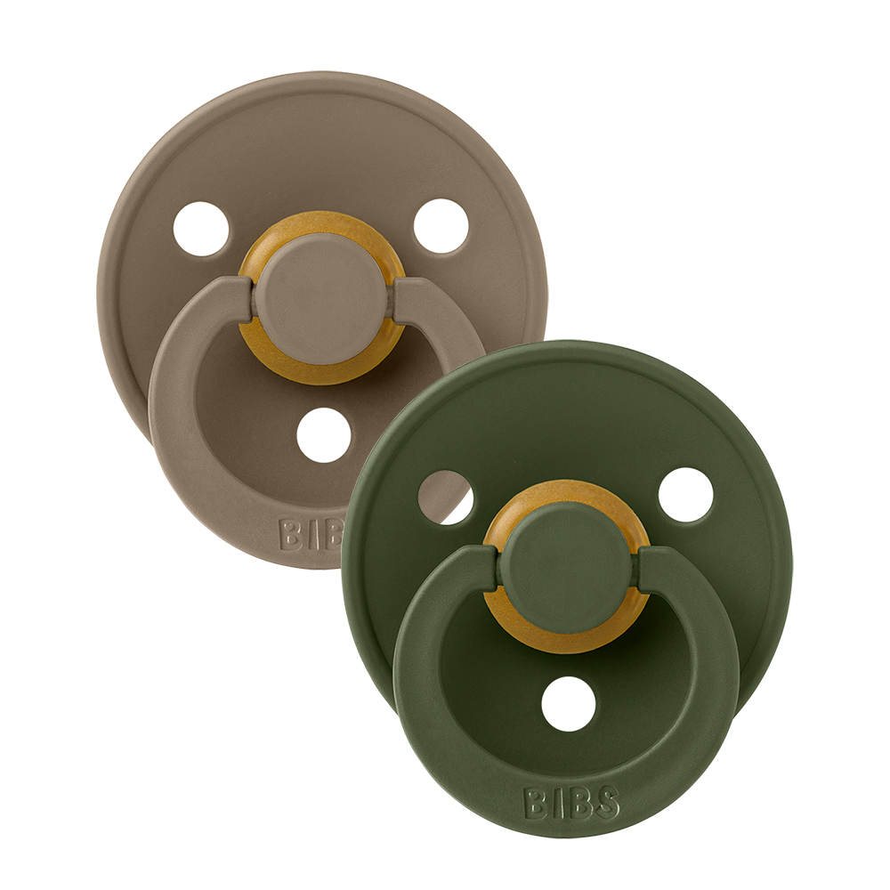 Our Colour pacifier is the original BIBS pacifier and has been on the market for over 40 years. It has the signature round BIBS shield with three vent holes and round BIBS engraved handle ring.