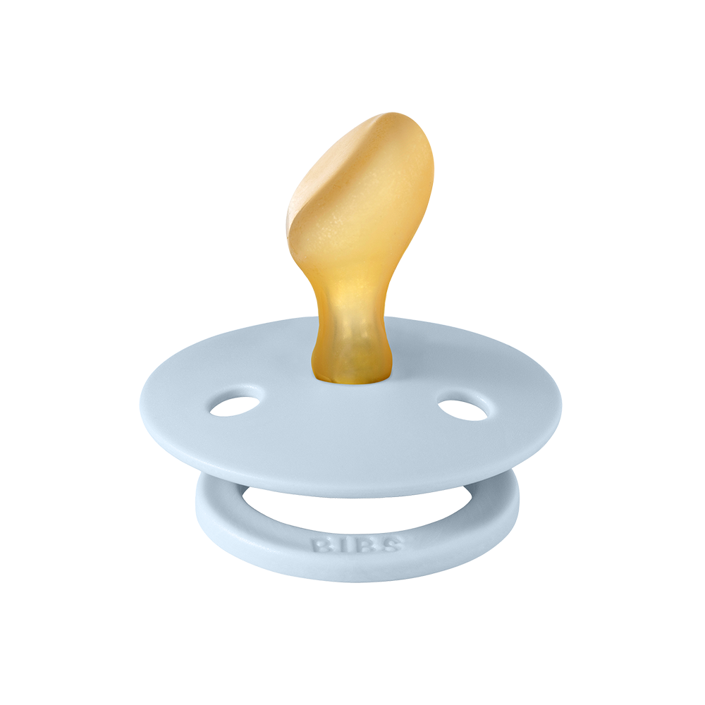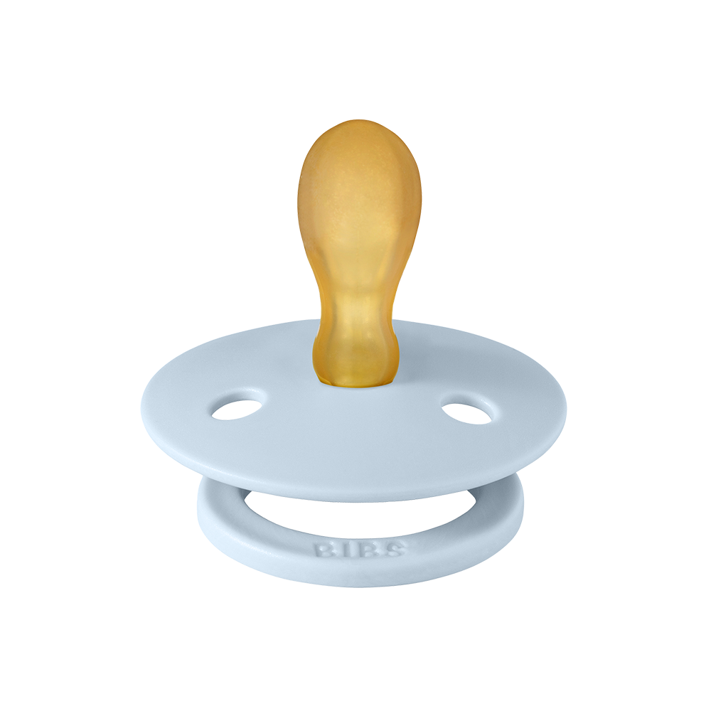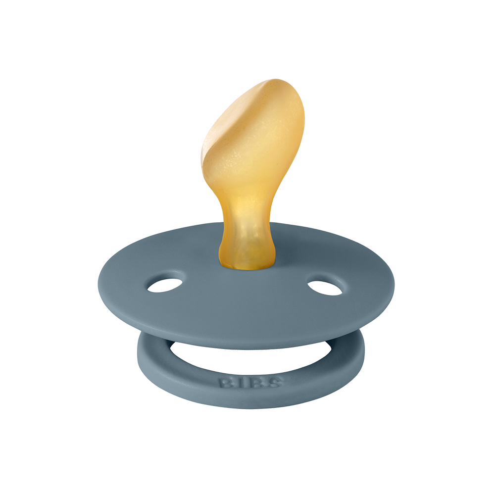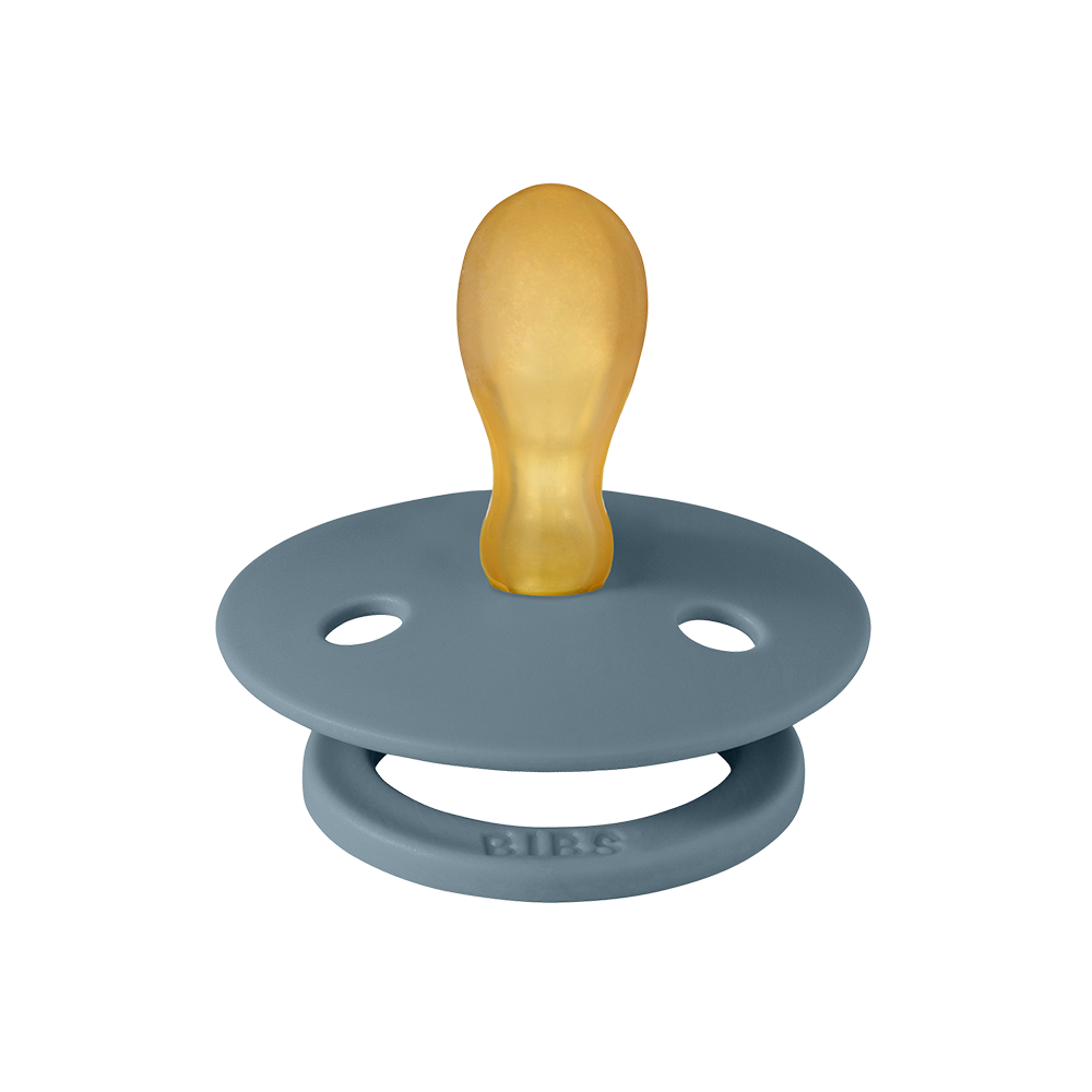 Our Colour pacifier is the original BIBS pacifier and has been on the market for over 40 years. It has the signature round BIBS shield with three vent holes and round BIBS engraved handle ring.