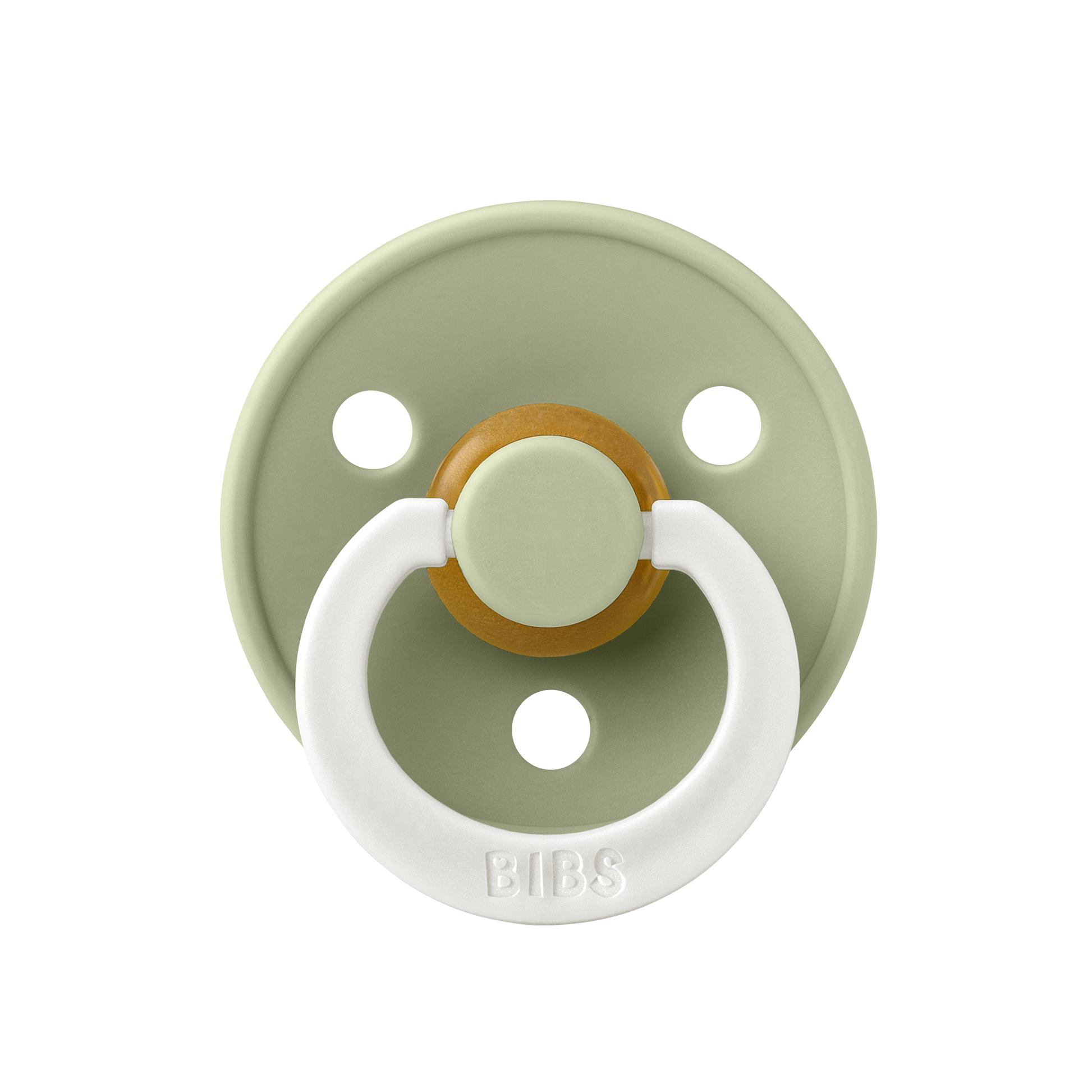 Our Colour pacifier is the original BIBS pacifier and has been on the market for over 40 years. It has the signature round BIBS shield with three vent holes and round BIBS engraved handle ring.
