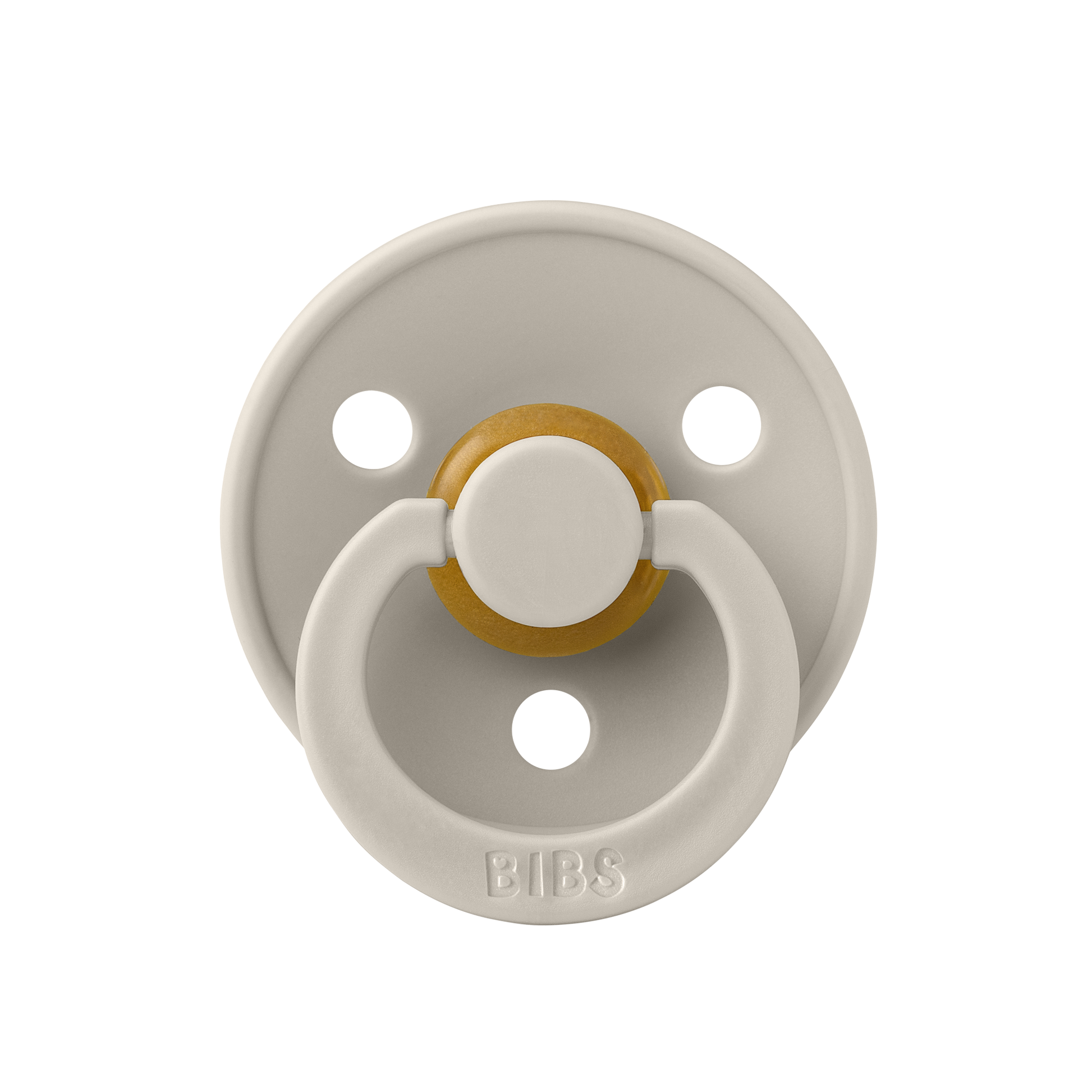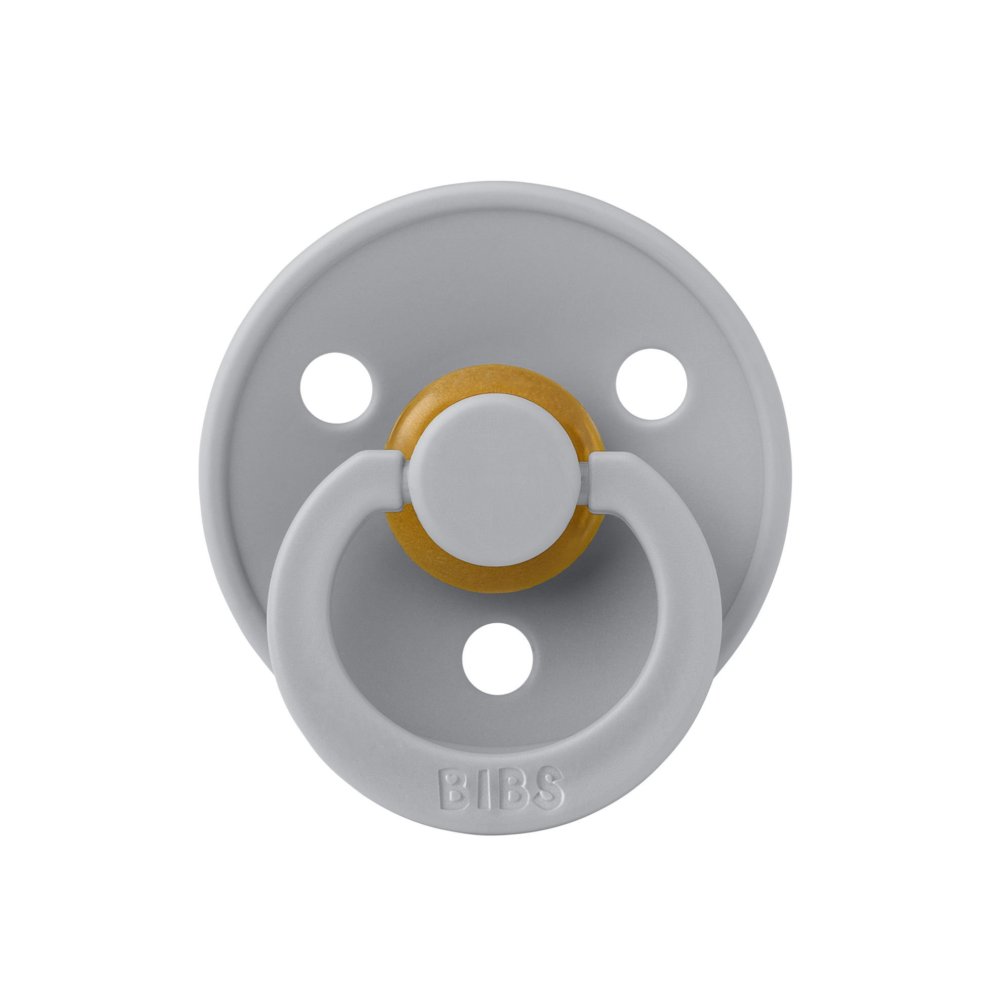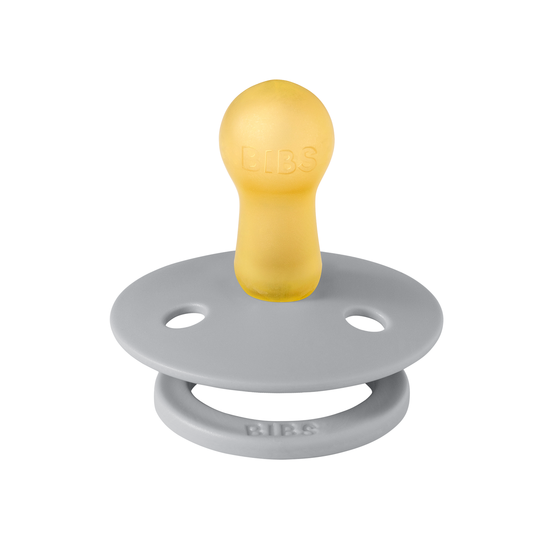 Our Colour pacifier is the original BIBS pacifier and has been on the market for over 40 years. It has the signature round BIBS shield with three vent holes and round BIBS engraved handle ring.