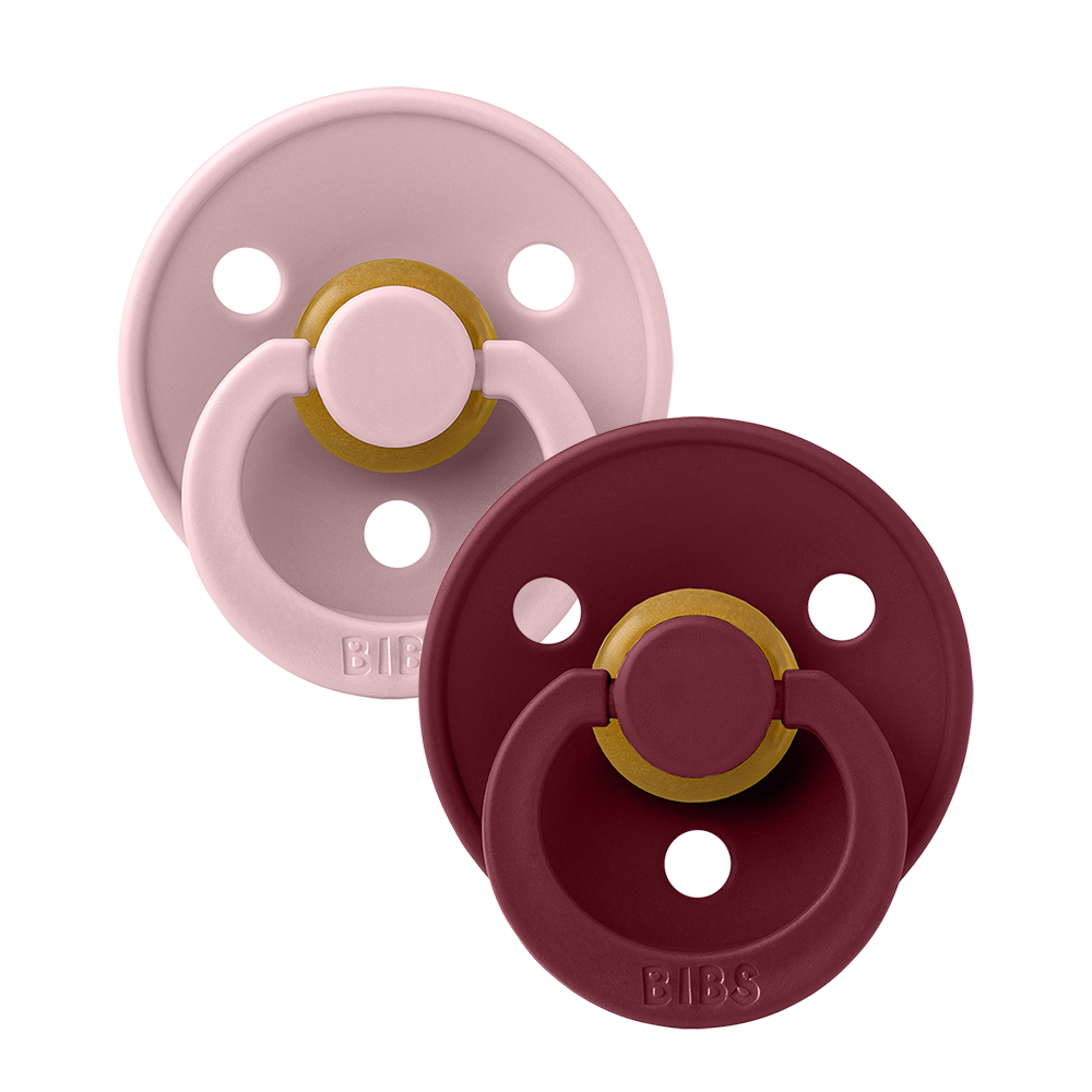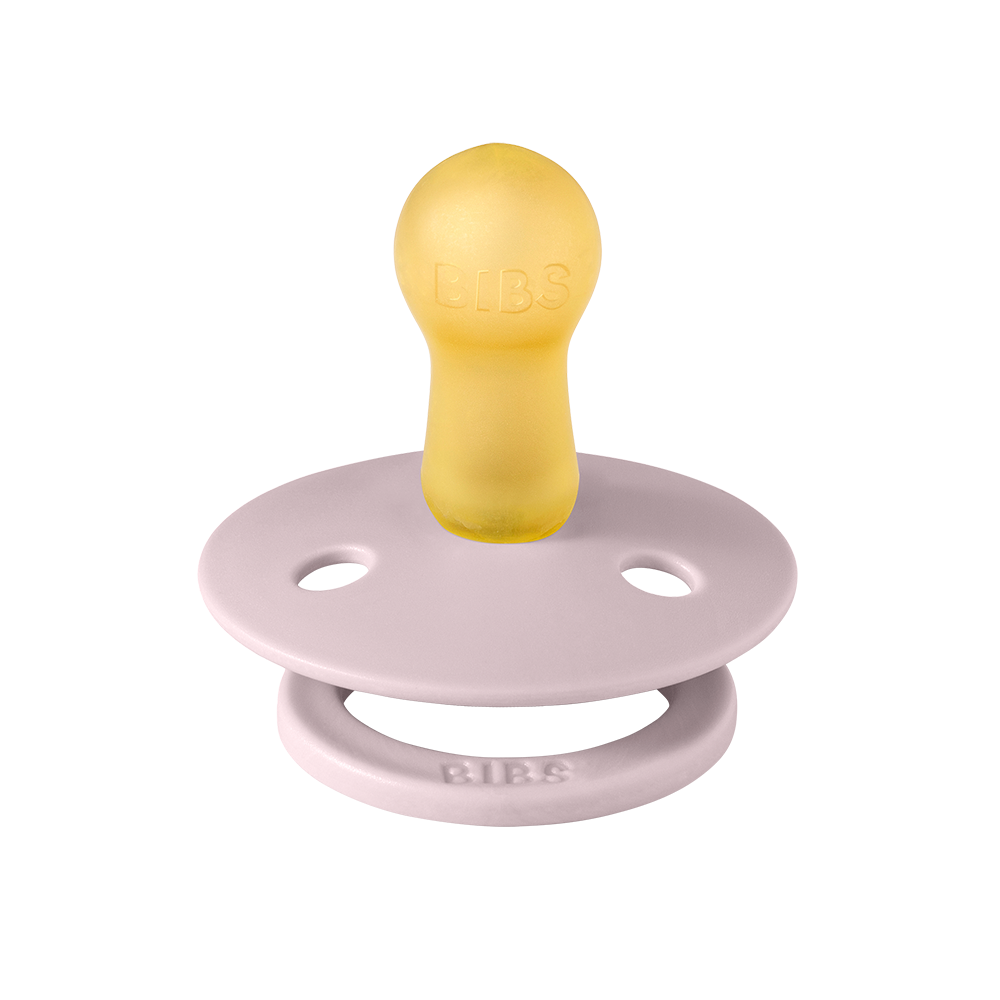 Our Colour pacifier is the original BIBS pacifier and has been on the market for over 40 years. It has the signature round BIBS shield with three vent holes and round BIBS engraved handle ring.