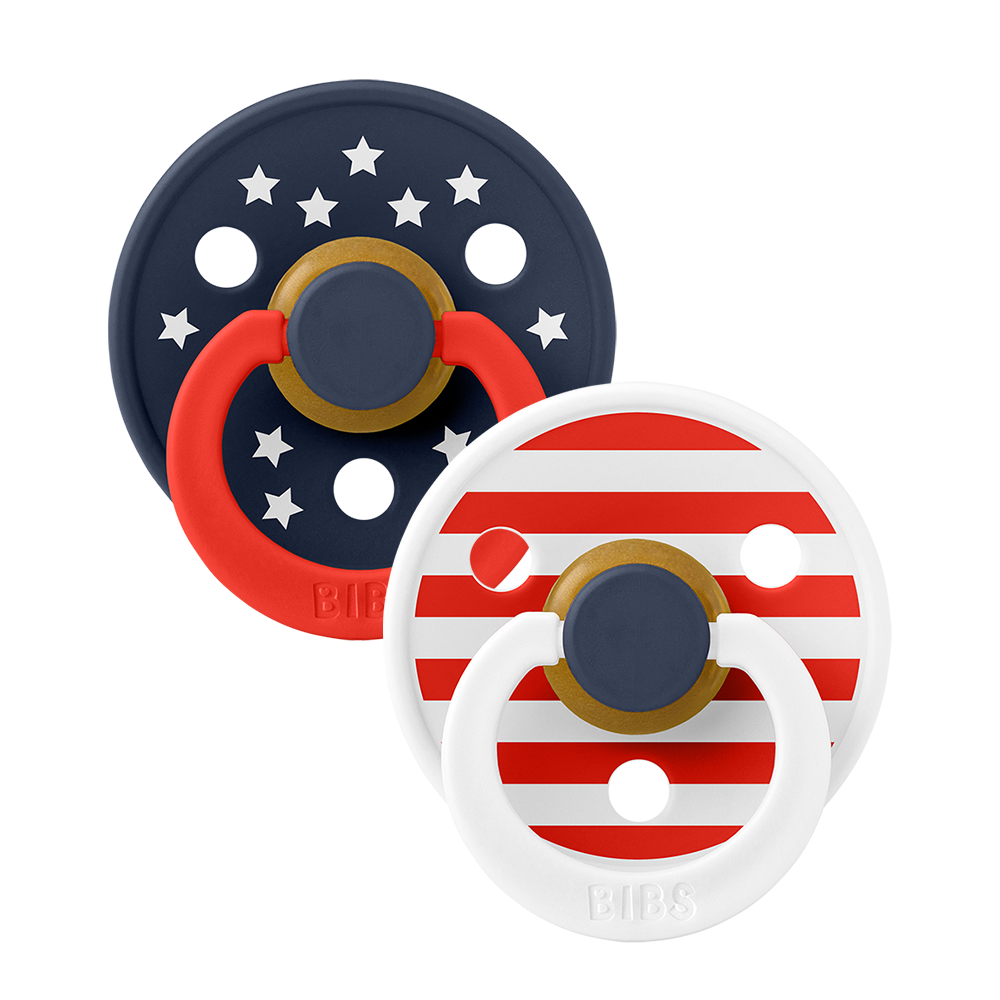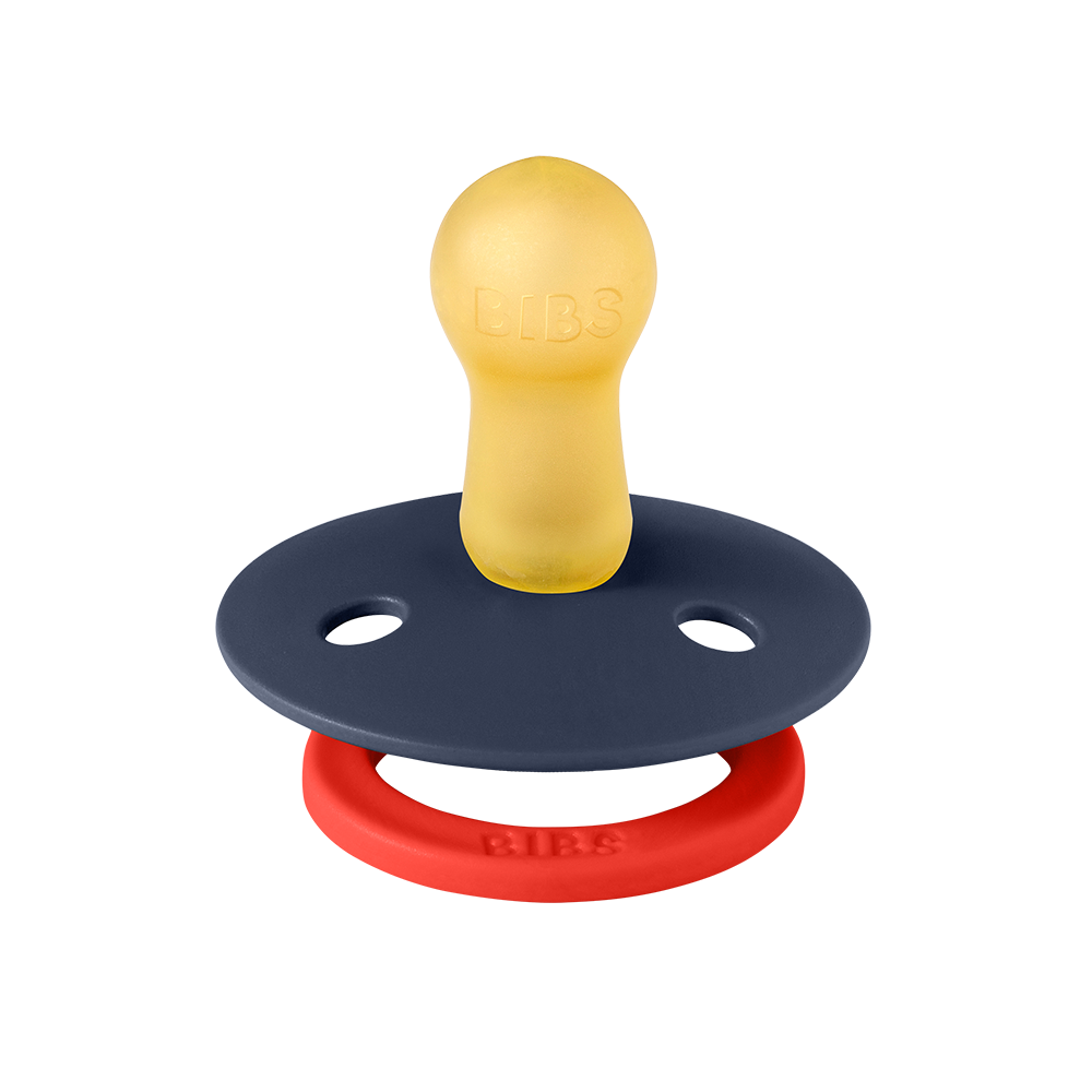 Our Colour pacifier is the original BIBS pacifier and has been on the market for over 40 years. It has the signature round BIBS shield with three vent holes and round BIBS engraved handle ring.