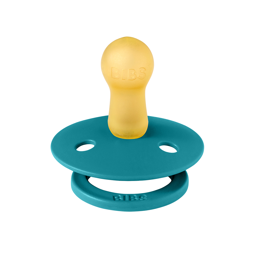 Our Colour pacifier is the original BIBS pacifier and has been on the market for over 40 years. It has the signature round BIBS shield with three vent holes and round BIBS engraved handle ring.