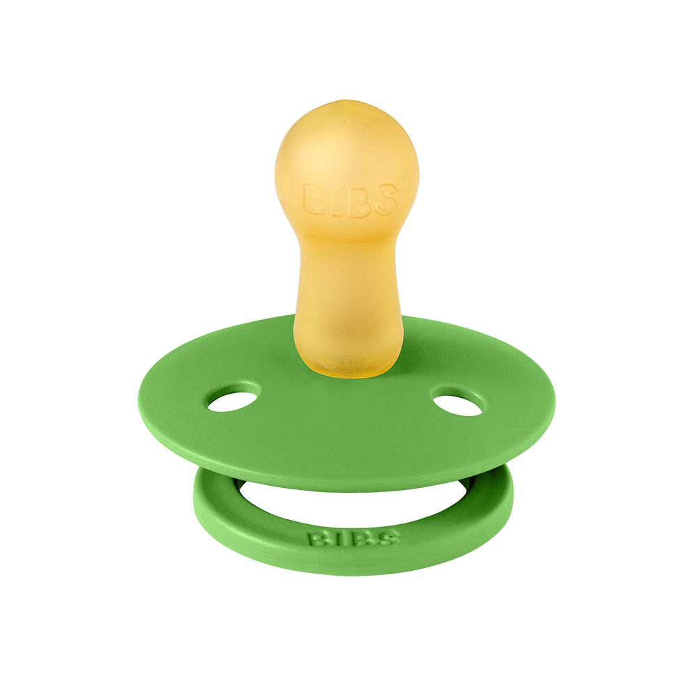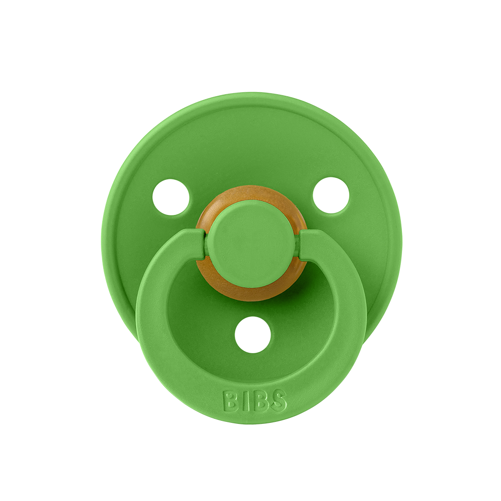 Our Colour pacifier is the original BIBS pacifier and has been on the market for over 40 years. It has the signature round BIBS shield with three vent holes and round BIBS engraved handle ring.