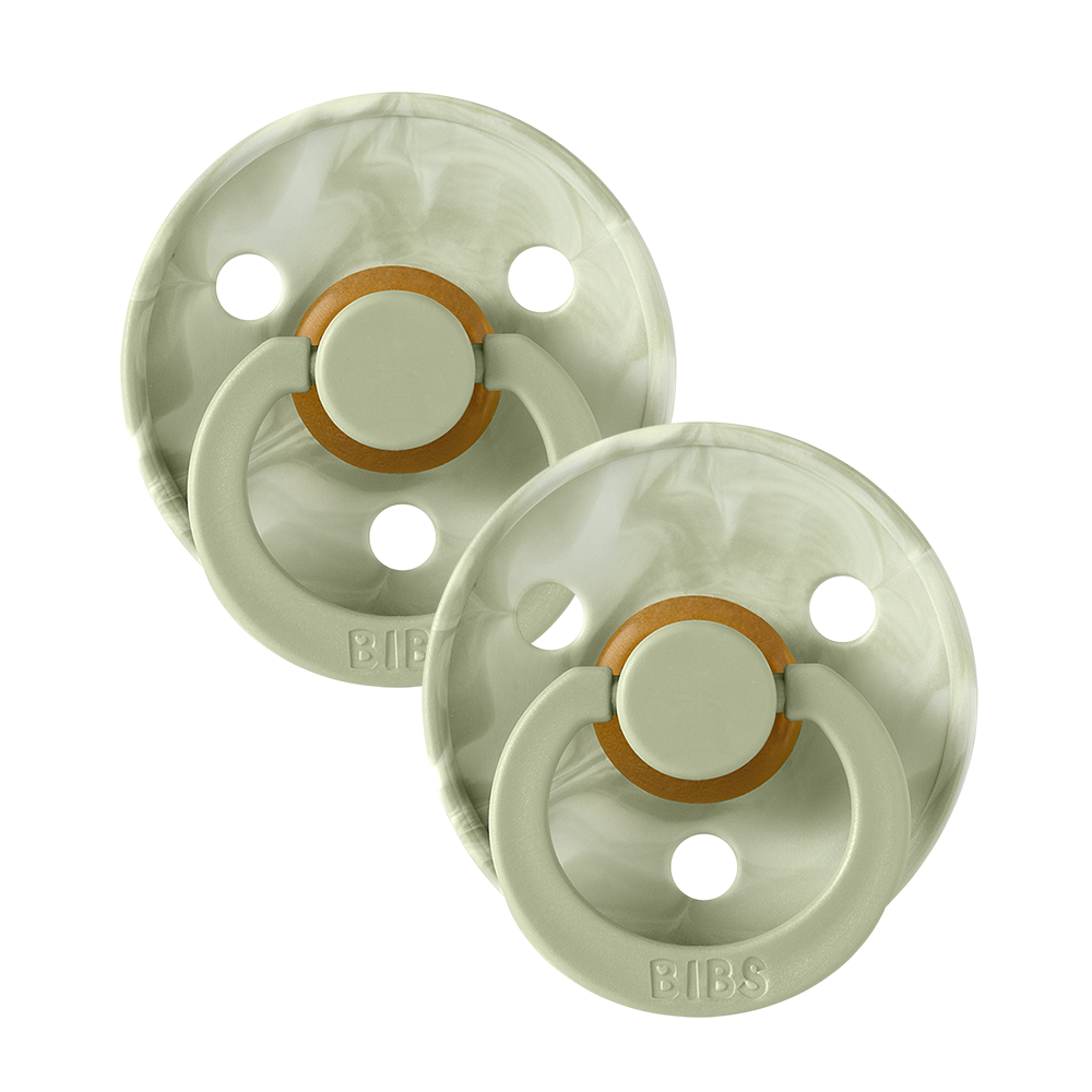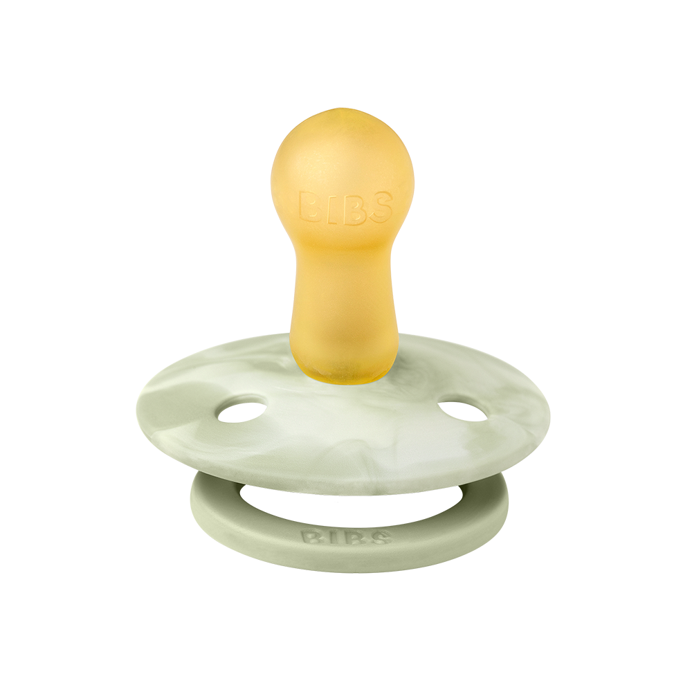 Our Colour pacifier is the original BIBS pacifier and has been on the market for over 40 years. It has the signature round BIBS shield with three vent holes and round BIBS engraved handle ring.