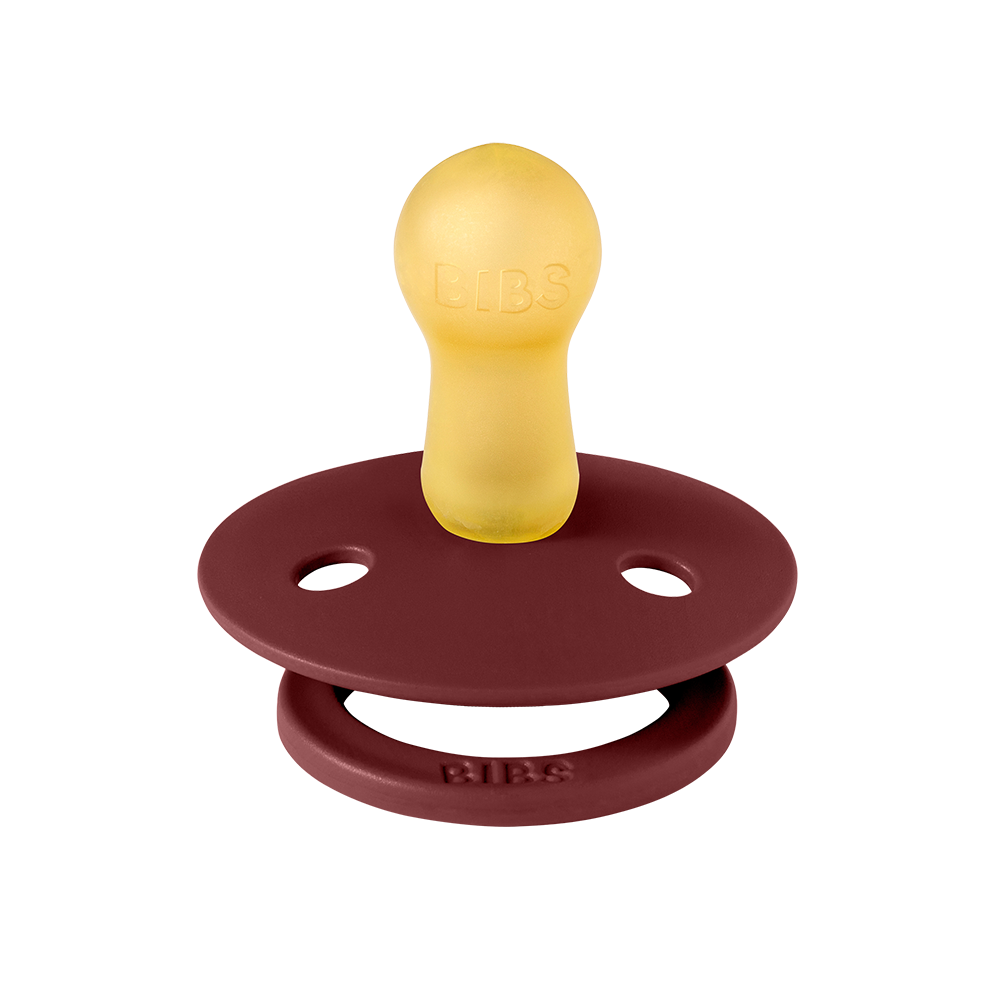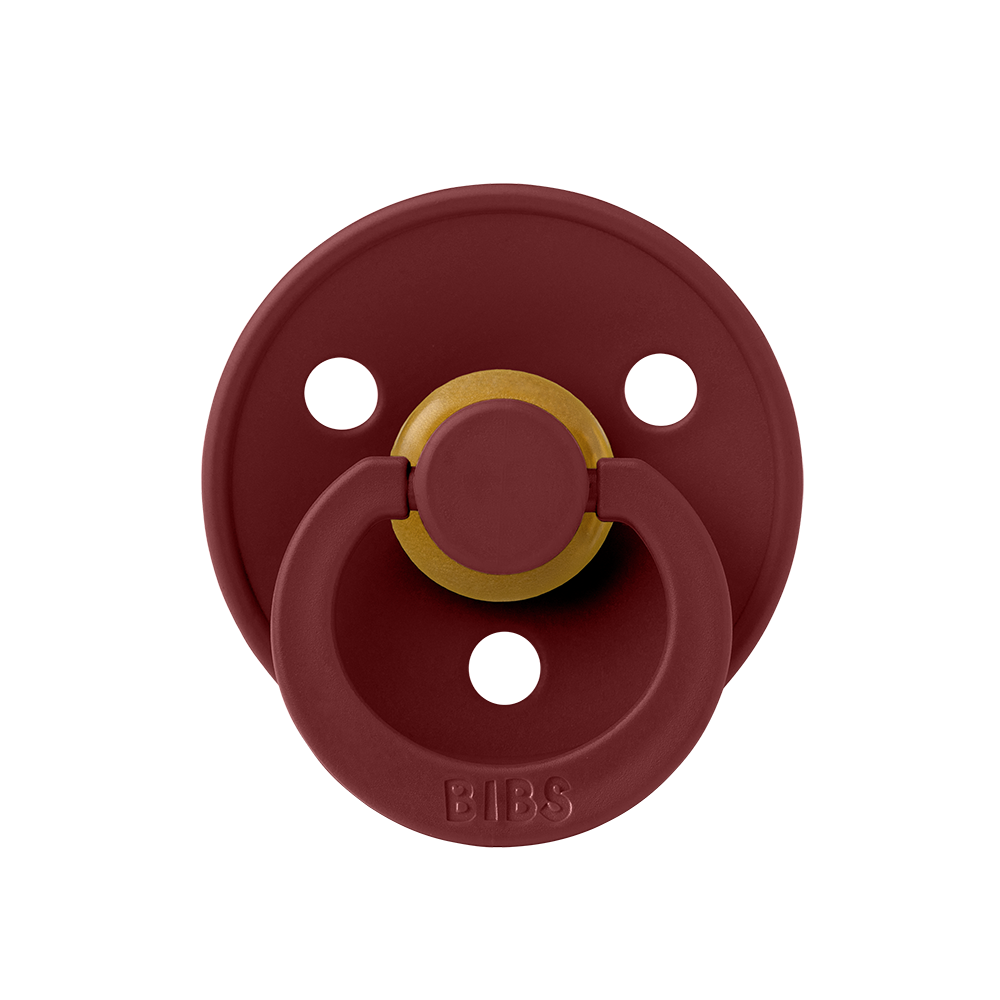 Our Colour pacifier is the original BIBS pacifier and has been on the market for over 40 years. It has the signature round BIBS shield with three vent holes and round BIBS engraved handle ring.