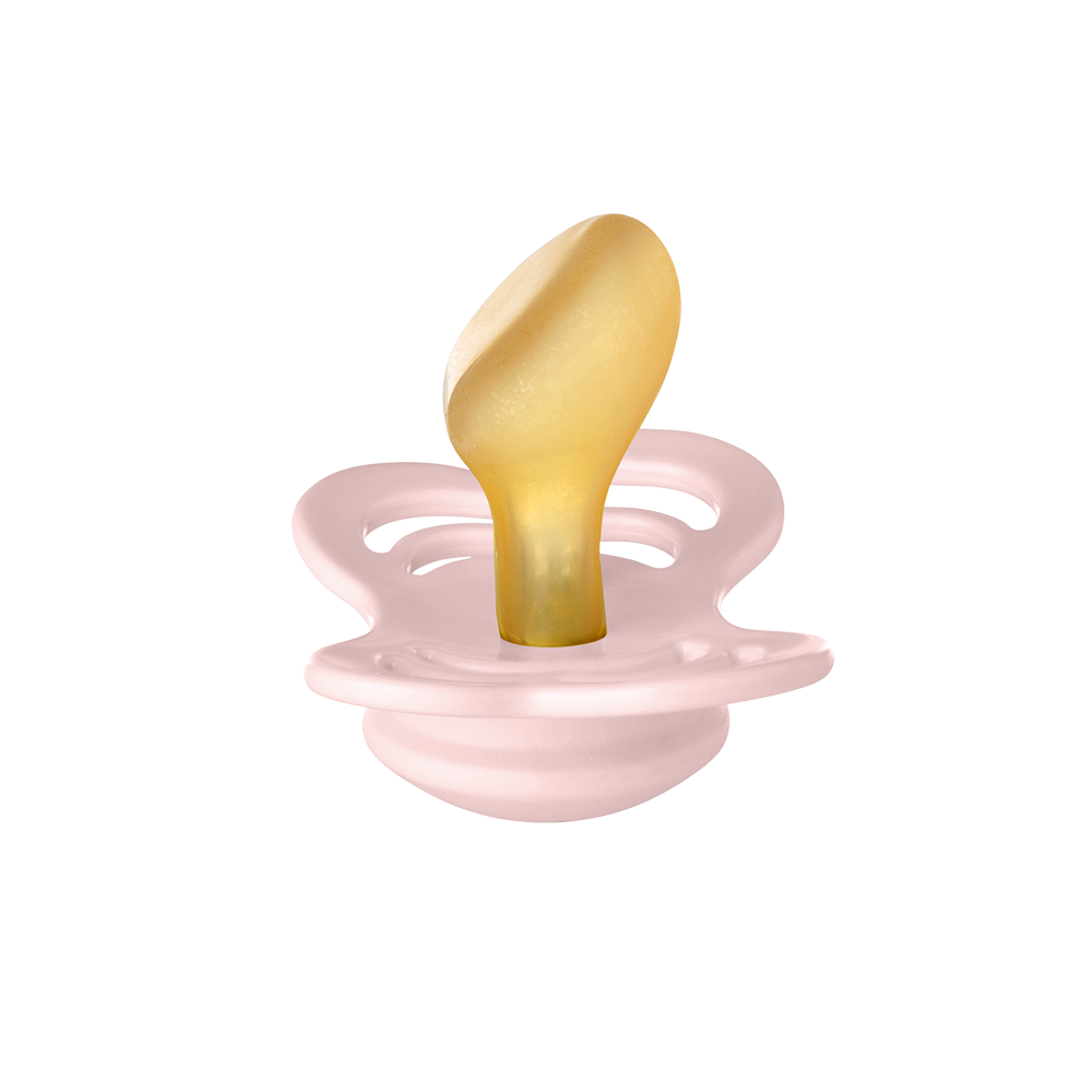 Couture comes with an anatomical nipple that is curved at the top for a natural fit to the baby's palate with an angled tip for easy placement of the tongue. This nipple promotes a tongue placement and sucking technique where the sides of the tongue cup around the nipple, like it, does during breastfeeding. The angled tip means that the baby does not need to suck as hard for the pacifier to flatten inside the mouth.