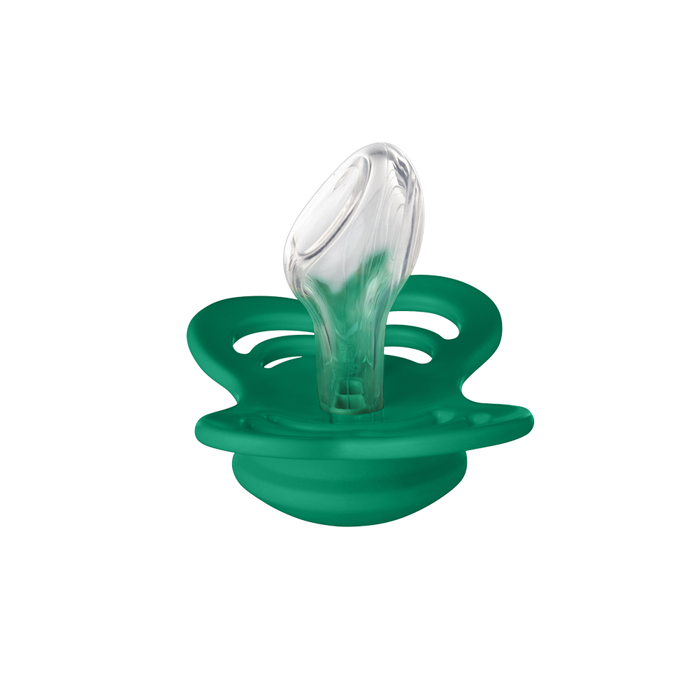 The curved top promotes a tongue placement and sucking technique where the sides of the tongue cup around the nipple, like it, does during breastfeeding. The angled tip means that the baby does not need to suck as hard for the pacifier to flatten inside the mouth.