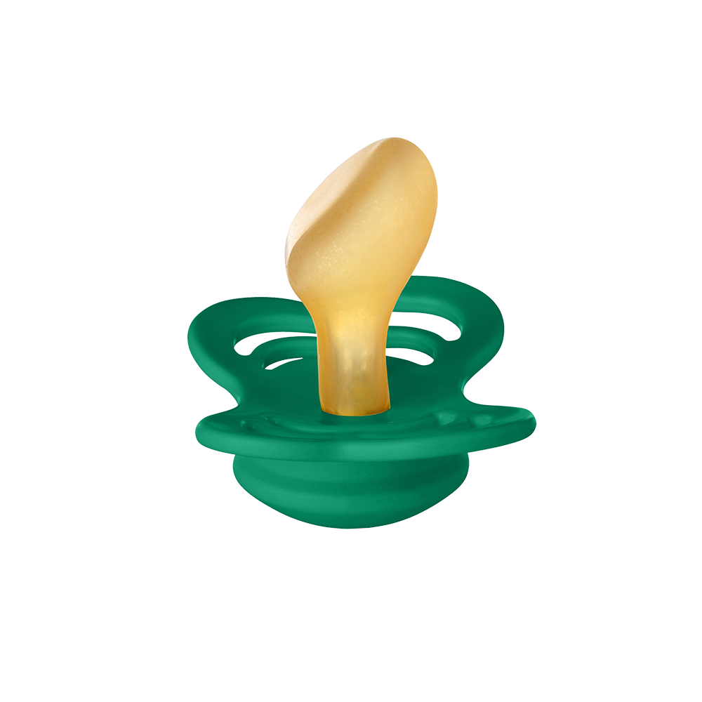 The curved top promotes a tongue placement and sucking technique where the sides of the tongue cup around the nipple, like it, does during breastfeeding. The angled tip means that the baby does not need to suck as hard for the pacifier to flatten inside the mouth.
