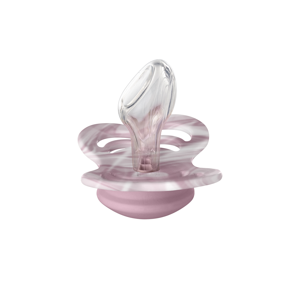 Couture comes with an anatomical nipple that is curved at the top for a natural fit to the baby's palate with an angled tip for easy placement of the tongue. This nipple promotes a tongue placement and sucking technique where the sides of the tongue cup around the nipple, like it, does during breastfeeding. The angled tip means that the baby does not need to suck as hard for the pacifier to flatten inside the mouth.