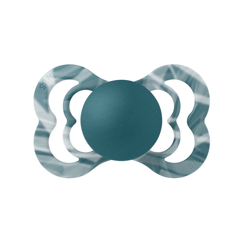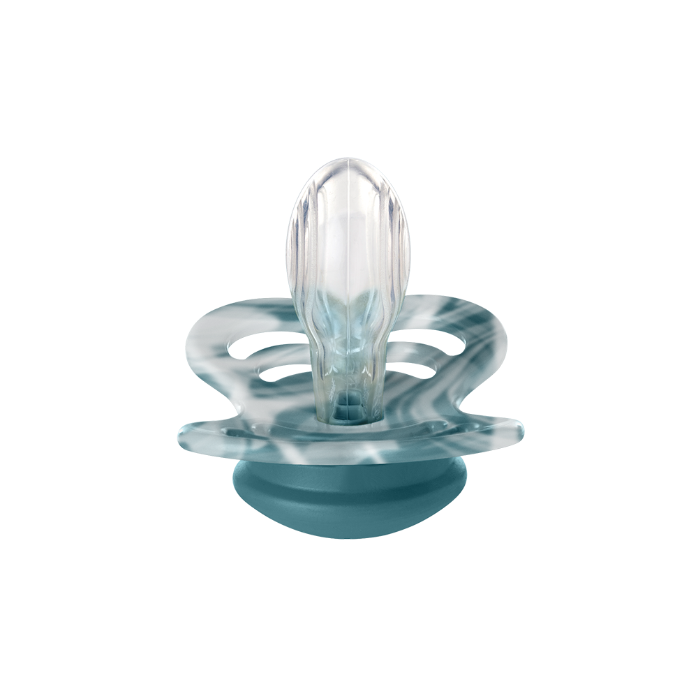 The symmetrical flat drop-shaped nipple promotes a tongue placement and sucking technique, where the tongue is flat and presses the pacifier flat against the palate, which means that the baby does not have to suck as hard as with a round pacifier for the pacifier to flatten out inside the mouth.