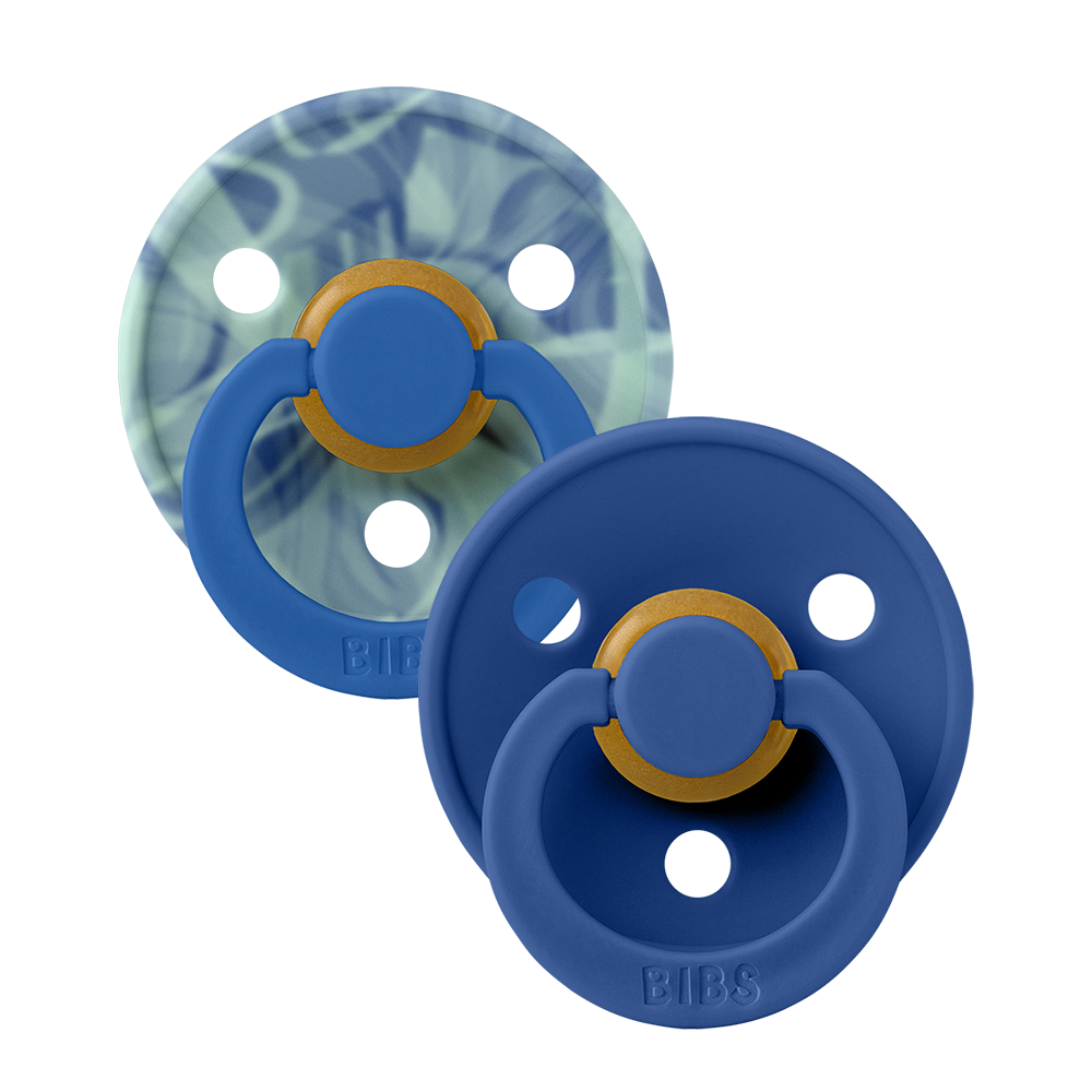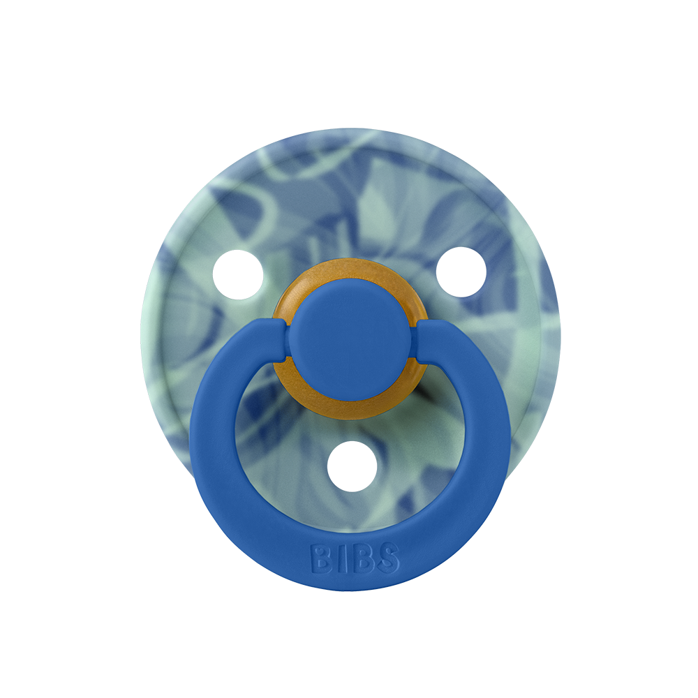 Our Colour pacifier is the original BIBS pacifier and has been on the market for over 40 years. It has the signature round BIBS shield with three vent holes and round BIBS engraved handle ring.