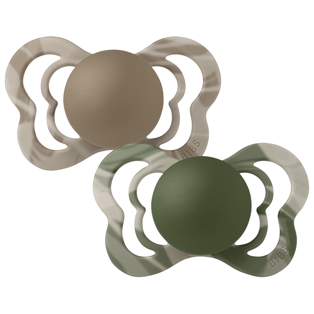 The Camo Collection consists of pacifiers in a natural woodland aesthetic.