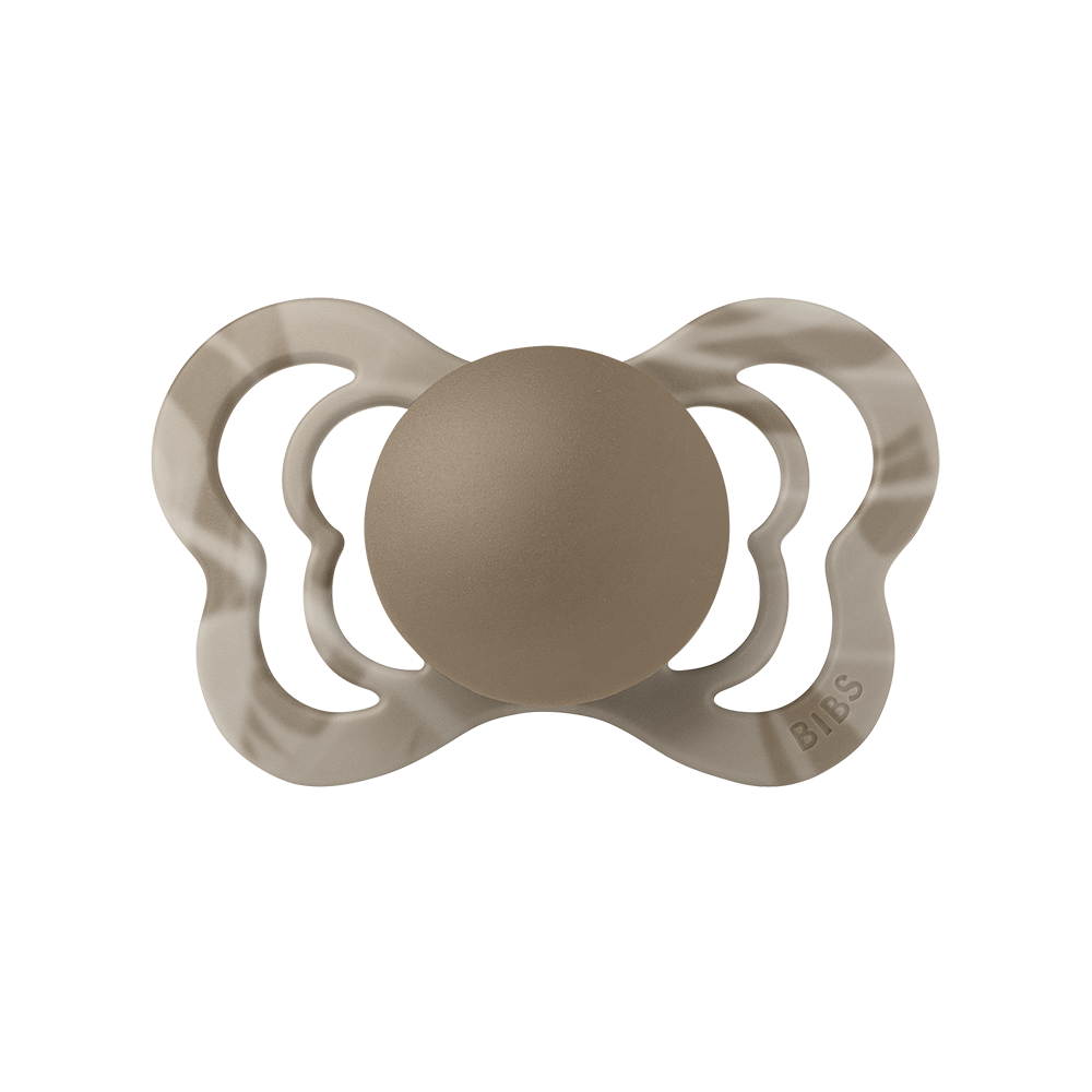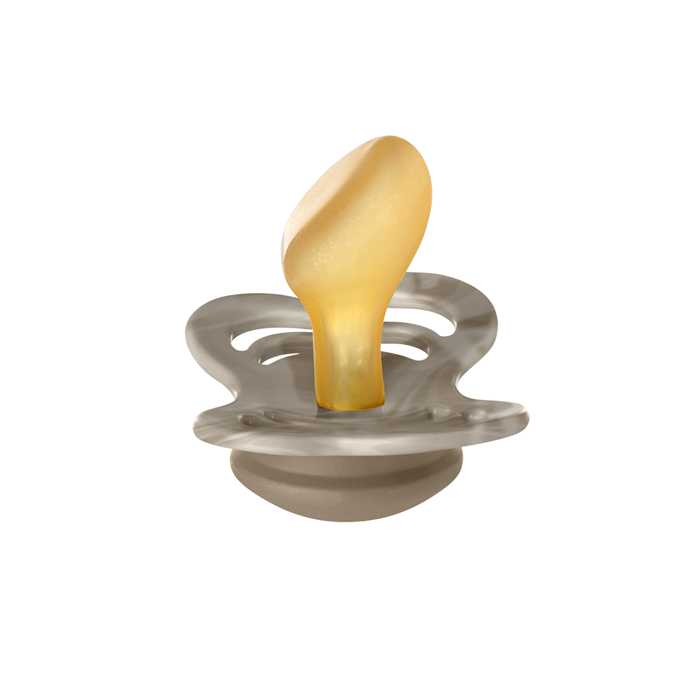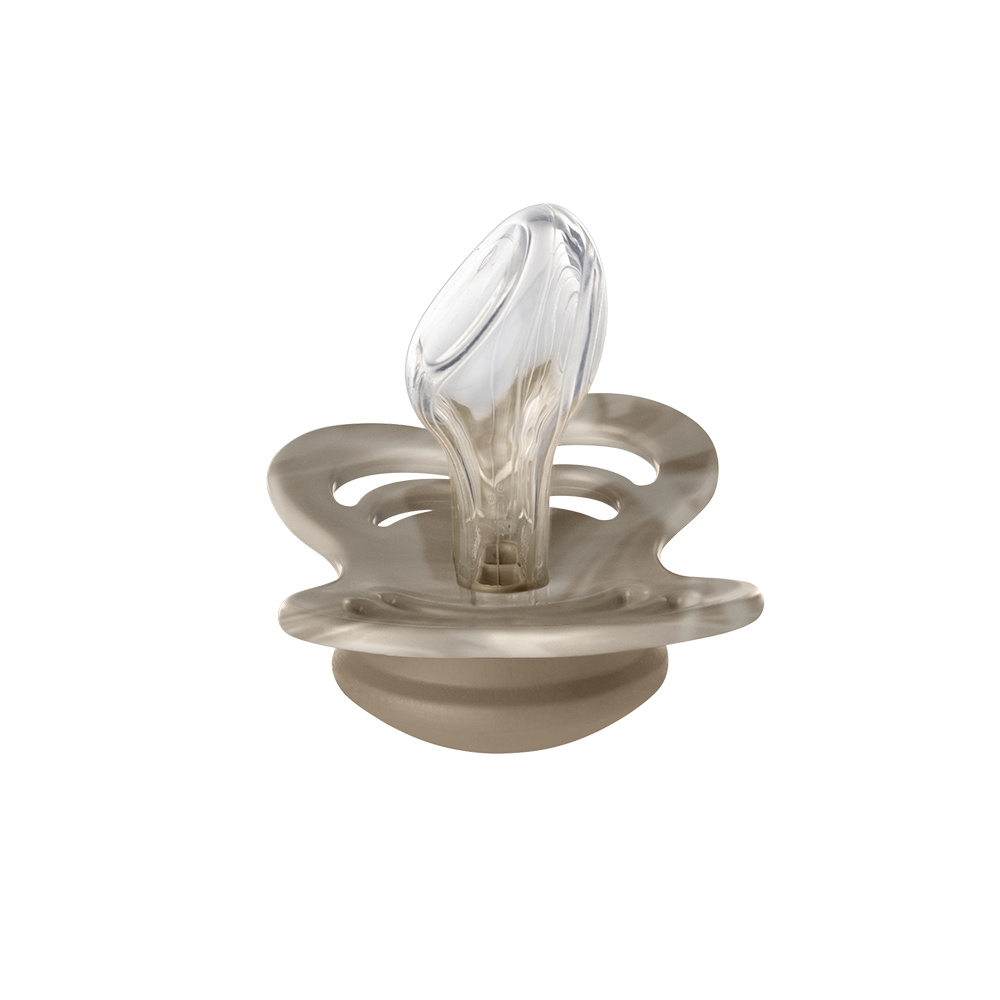 Couture comes with an anatomical nipple that is curved at the top for a natural fit to the baby's palate with an angled tip for easy placement of the tongue. This nipple promotes a tongue placement and sucking technique where the sides of the tongue cup around the nipple, as it does during breastfeeding. The angled tip means that the baby does not need to suck as hard for the pacifier to flatten inside the mouth.
